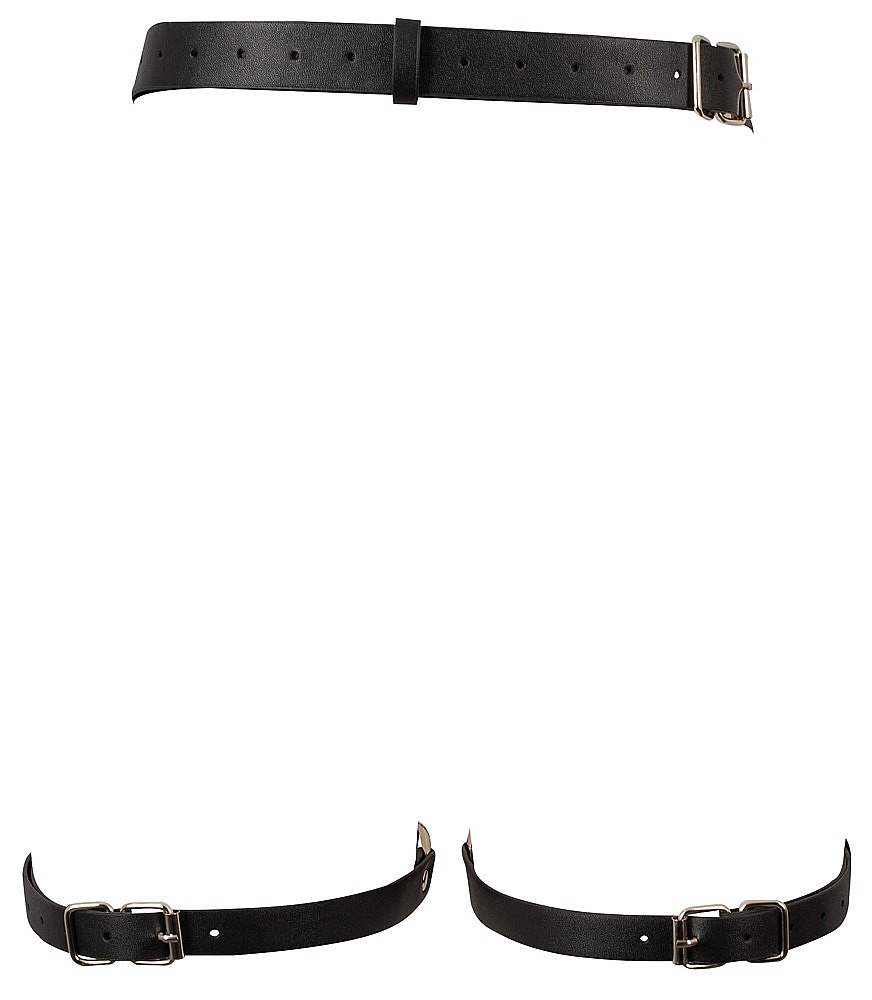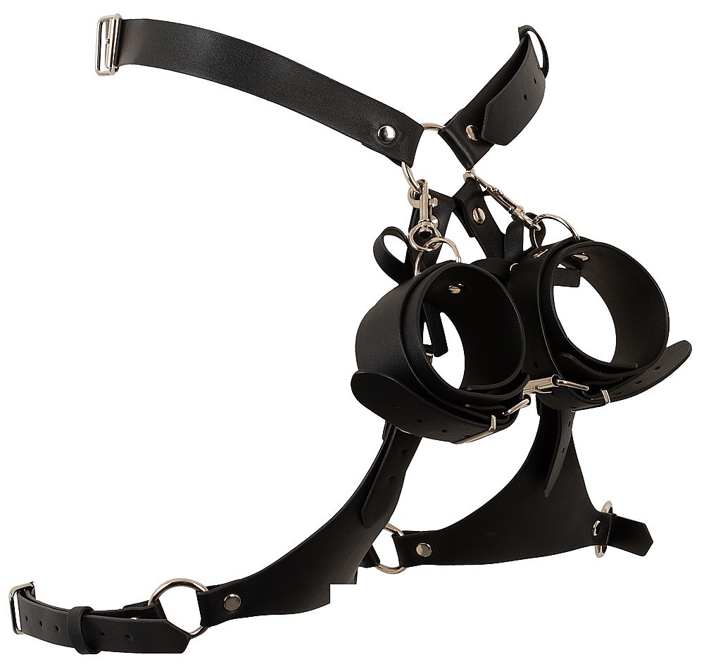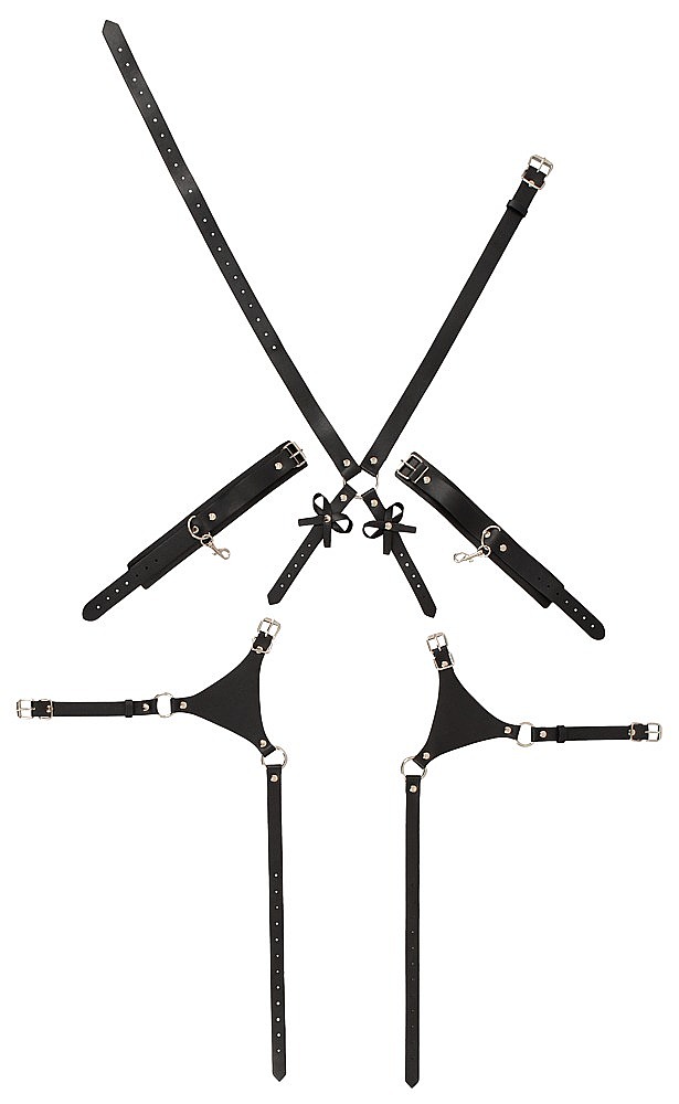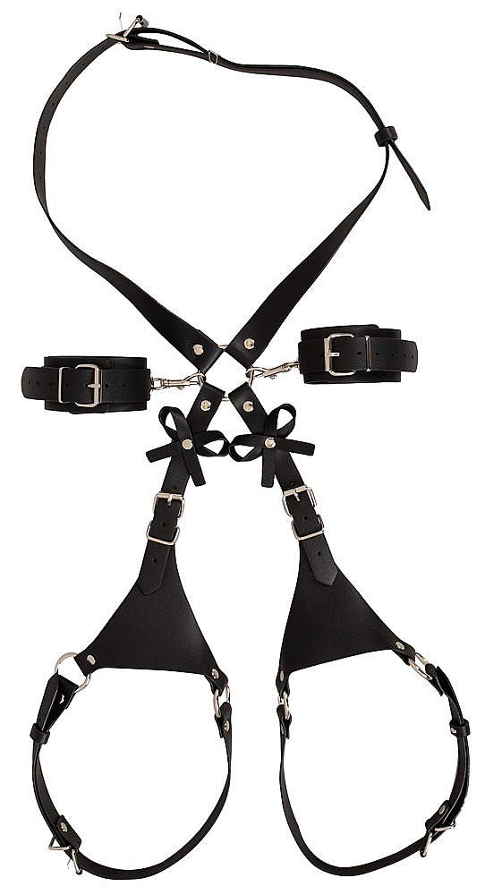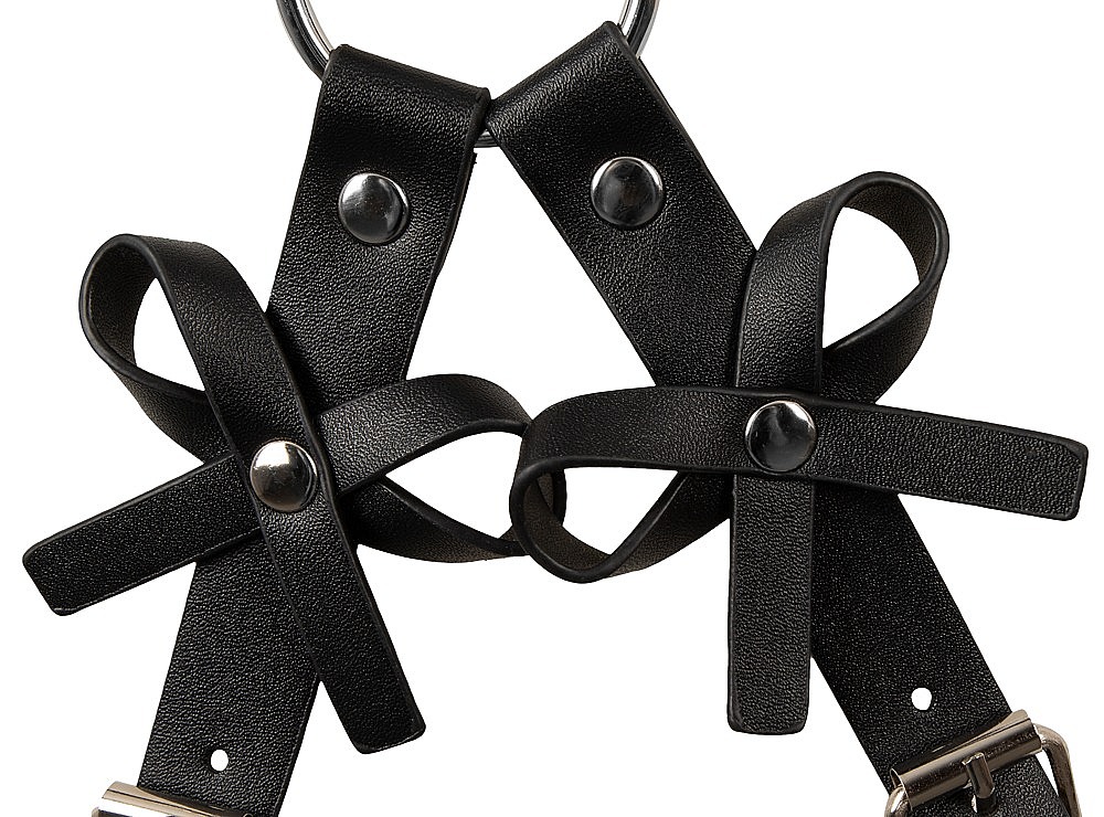 Bad Kitty Body Harness with Cuffs od značky Bad Kitty je extravagantní tělový postroj s pouty, který zaujme výrazným vzhledem i praktickým provedením. Stylová černá imitace kůže v kombinaci se stříbrně zbarvenými cvočky a kroužky vytváří neodolatelně provokativní celek. Bederní postroj se stehenními popruhy lze nastavit v několika místech pomocí přezek, takže krásně přilne k tělu a zvýrazní siluetu. Dva podvazkové popruhy s hravými mašličkami je možné nosit vpředu i vzadu, a přizpůsobit tak vzhled i atmosféru podle chuti. Měkká pouta na ruce s nastavitelným zapínáním drží pohodlně a bezpečně, zatímco karabinky umožní jejich rychlé připnutí k postroji. Celek tak spojuje dekorativní vzhled, erotické napětí i možnost svůdné kontroly v jednom propracovaném doplňku.
