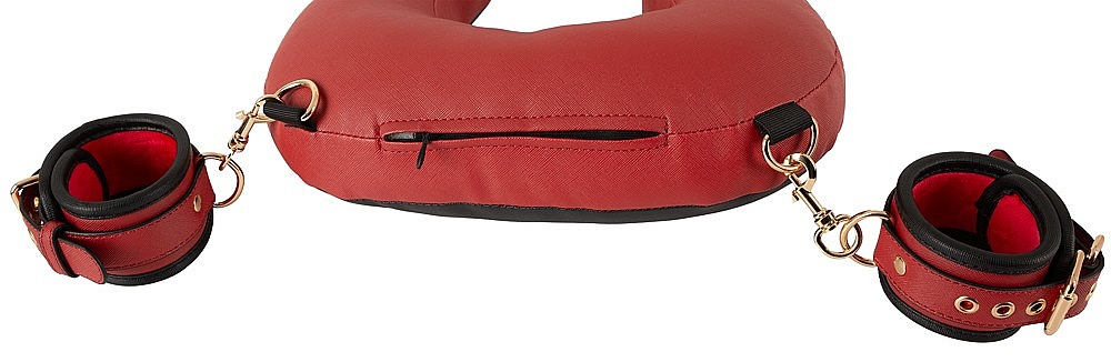Bad Kitty Thigh Restraint Set with Neck Cushion and Handcuffs od značky Bad Kitty přináší promyšlené spojení komfortu, stylu a erotické kontroly. Luxusní kombinace červené a černé imitace kůže se zlatě zbarvenými kovovými detaily působí výrazně, svůdně a elegantně zároveň. Měkký, ergonomicky tvarovaný krční polštář poskytuje příjemnou oporu a zpříjemňuje i delší hrátky. Nastavitelné smyčky na stehna pomáhají stabilně držet požadovanou polohu a otevírají prostor pro intenzivnější partnerské scénáře. Odnímatelná pouta na ruce dodávají celé sadě další úroveň variability, takže si snadno přizpůsobíte míru omezení i styl hry. Díky měkkému povrchu z imitace kůže a jemnému polstrování je kontakt s pokožkou příjemný a vhodný i pro delší používání. Pouta se rychle nasazují, upravují pomocí přezek a díky karabinám je lze snadno připnout ke krčnímu polštáři, odepnout nebo spojit k sobě jako klasická pouta. Výsledkem je rafinovaná BDSM pomůcka, která kombinuje fixaci, pohodlí a dráždivý vizuální efekt v jednom stylovém celku.