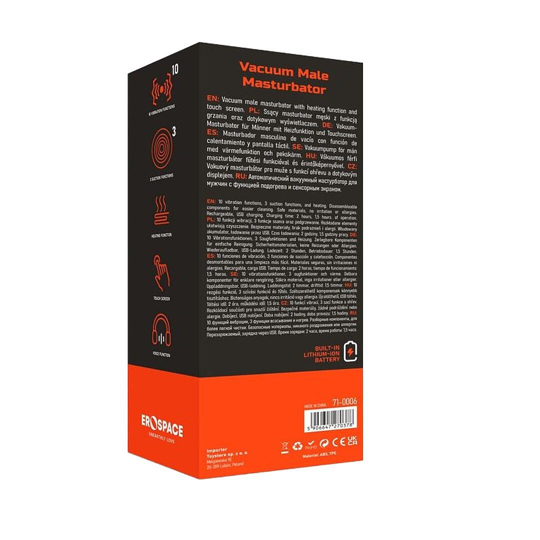 Erospace Men's Play B6 Suction Male Masturbator od značky Erospace je pánský masturbátor navržený pro silnou a proměnlivou stimulaci. Nabízí 10 vibračních funkcí, takže si můžete dopřát jemné chvění i výrazně pulzující jízdu podle aktuální nálady. Díky 3 sacím funkcím napodobuje rytmické nasávání a uvolňování, čímž vytváří vzrušující iluzi pohybu a plnějšího prožitku. Topná funkce přidává příjemné zahřátí, které umocňuje smyslnost každého doteku a podporuje autentičtější pocit. Vnitřní rukáv z materiálu Cyberskin je příjemný na kontakt s pokožkou a přispívá k realistickému, hebkému zážitku. Pevný plášť z ABS zajišťuje stabilitu, odolnost a pohodlnou manipulaci. Moderní dotykový displej umožňuje snadno přepínat funkce a mít stimulaci plně pod kontrolou. Praktické rozebíratelné části usnadňují údržbu, takže si můžete užívat bez zbytečných starostí. Potěší také vestavěná dobíjecí baterie, která po plném nabití nabídne až 1,5 hodiny provozu. Nabíjení probíhá přes USB kabel a trvá přibližně 2 hodiny. Součástí je i hlasová funkce pro ještě intenzivnější a hravější atmosféru při použití se sluchátky.