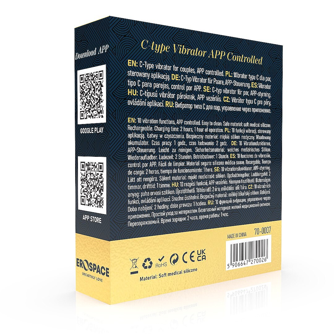 Erospace Sweet Play A7 C-Type Vibrator App Control od značky Erospace je navržený pro partnerské i sólové dovádění. Díky dvěma motorům umístěným na obou koncích přináší intenzivní stimulaci na více místech současně a pomáhá zesílit prožitek při milování i při soukromém objevování rozkoše. Ovládání přes aplikaci přidává svobodu, hravost i možnost jemně ladit tempo podle aktuální nálady, zatímco tlačítko přímo na pomůcce umožní rychlou a snadnou změnu režimů. K dispozici je 10 vibračních funkcí, se kterými si můžete vychutnat jemné chvění i výraznější pulzaci. Jemné vroubkování na povrchu zpříjemňuje kontakt s tělem a přidává další vrstvu smyslných podnětů. Sametově hebký lékařský silikon je hypoalergenní, šetrný k pokožce a velmi příjemný na dotek. Díky voděodolnosti IPX7 si můžete užít zábavu také ve vaně nebo ve sprše. Tichý chod motorů podporuje diskrétnost a vestavěná baterie s USB nabíjením se postará o pohodlné používání bez zbytečných starostí. Po použití pomůcku snadno omyjete a uložíte na další vzrušující chvíli.