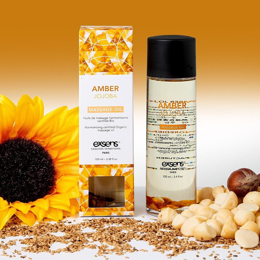 Exsens Organic Massage Oil Amber Jojoba vás vtáhne do světa relaxace díky své lehké, snadno vstřebatelné textuře a bohaté, teplé vůni. Jantar rozhání špatné nálady a generuje pozitivní energii, zatímco jojobový olej přidává péčí a výživu. Tento olej plyne snadno po pokožce a zanechává ji hedvábně hladkou.