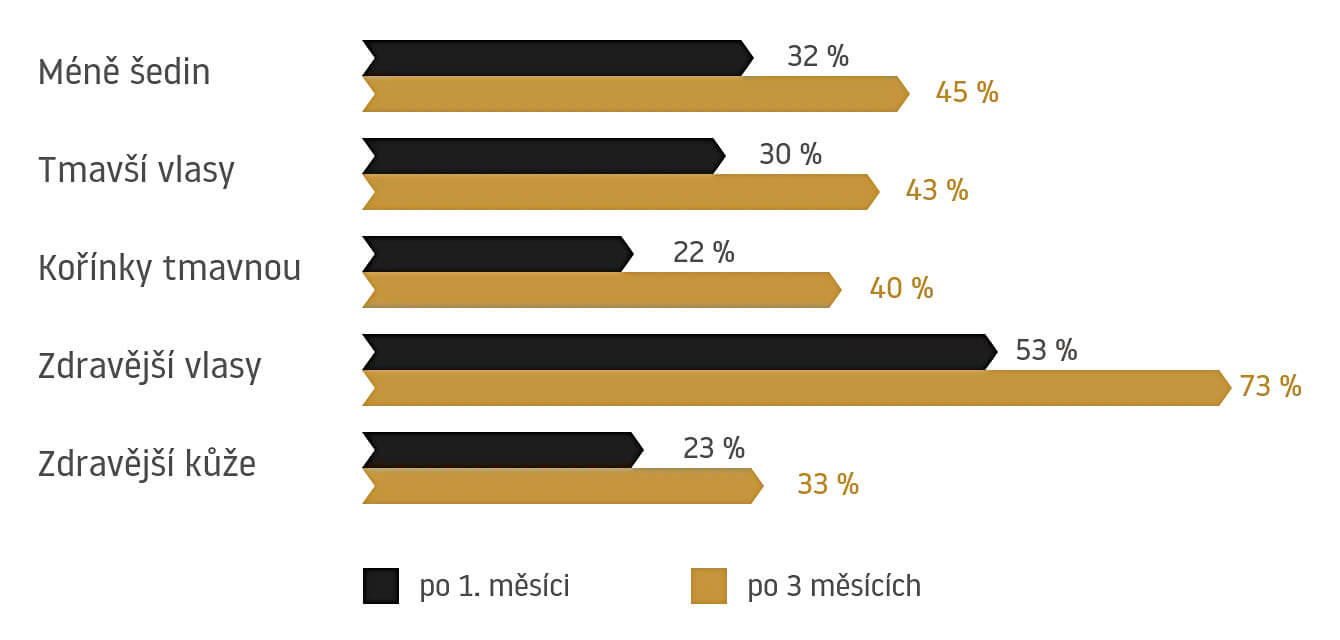 Darkenyl™ (1 %): Stabilizovaný antioxidant bojuje proti šedivým vlasů tím, že chrání vlasové folikuly před oxidací. Snižuje počet bílých vlasů o 56% po pravidelném užívání 4 měsíce.