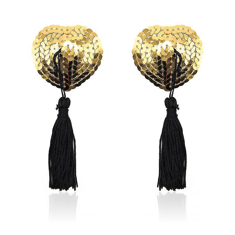 LATETOBED BDSM LINE Heart Nipple Cover with Gold Sequins od značky LATETOBED je erotický doplněk navržený pro milovníky intenzivních a temně svůdných požitků. Samolepicí krytky na bradavky ve tvaru srdce zaujmou na první pohled svým zlatým flitrovým povrchem, který krásně odráží světlo a dodává hravě luxusní vzhled. Dlouhý černý střapec vytváří při pohybu vzrušující efekt, zvýrazňuje každý detail a pomáhá dotvořit odvážný, flirtující i BDSM inspirovaný styling. Díky samolepicímu provedení se snadno aplikují a skvěle poslouží jako rafinovaný doplněk pro intimní večery, svádění i odvážné překvapení pro partnera.