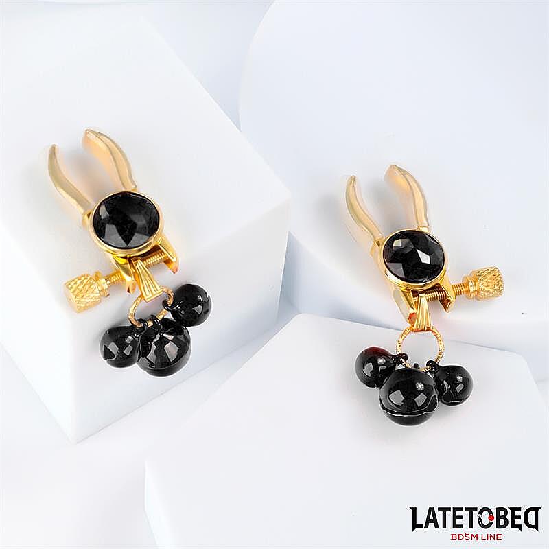LATETOBED BDSM LINE Nipple Clamps with Bell od značky LATETOBED jsou stvořené pro milovníky intenzivních a temnějších požitků, kteří si chtějí dopřát stylovou i funkční erotickou pomůcku. Menší provedení klipsů působí decentněji než běžné svorky, takže nabízí přesnější přítlak a svůdný pocit kontroly. Kovové zpracování dodává pevnost, odolnost a chladivý dotek, který umí vzrušení ještě zvýraznit. Ozdobné černé rolničky přinášejí hravý zvukový efekt, jenž podtrhuje každý pohyb a proměňuje intimní hru v ještě intenzivnější zážitek. Lesklé kamínkové detaily navíc dodávají celku luxusní, elegantní a neodolatelně provokativní vzhled.