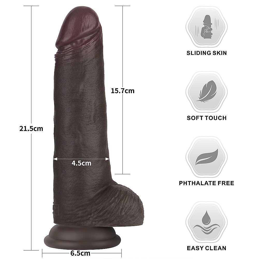 Sliding Skin Pro II 8,5'' Dual Layer Silicone Dong (Black) od značky Lovetoy využívá druhou generaci technologie sliding skin, díky níž působí na dotek ještě jemněji, přirozeněji a pohodlněji. Pokročilá dvouvrstvá konstrukce kombinuje hebký vnější plášť s pevným vnitřním jádrem, takže při používání věrně napodobuje pocit ztopořeného penisu. Lékařský silikon s dvojí hustotou nabízí vysoký komfort, dlouhou životnost a mimořádně autentický kožní efekt. Každý dotek je hladký, poddajný a zároveň dostatečně pevný pro intenzivní a uspokojivou stimulaci. Realisticky zpracovaný dřík je navržen tak, aby poskytoval smyslný zážitek při sólové hře i partnerských hrátkách. Pro ještě hladší a příjemnější klouzání se doporučuje použití lubrikantu na vodní bázi.