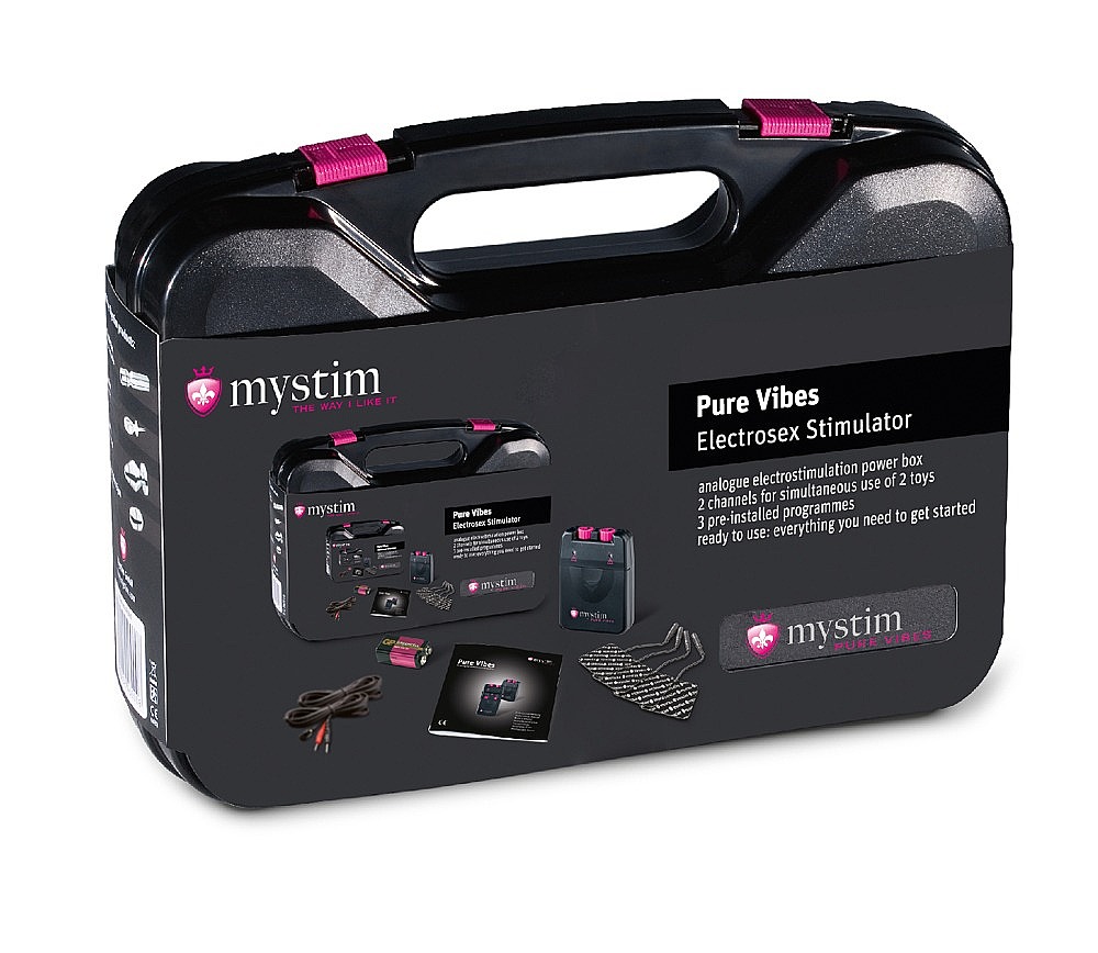 Elektro-sex Mystim Pure Vibes je základem pro elektro stimulaci při elektro sexu. Sada zdroje proudu a plochých elektrod pro základní elektrostimulaci svalů a sliznic celého těla. Přístroj má 3 přednastavené režimy a libovolné ruční nastavení obou oddělených kanálů. Samostatně si můžete regulovat intenzitu, velikost pulzů (jejich šířku) a frekvenci.