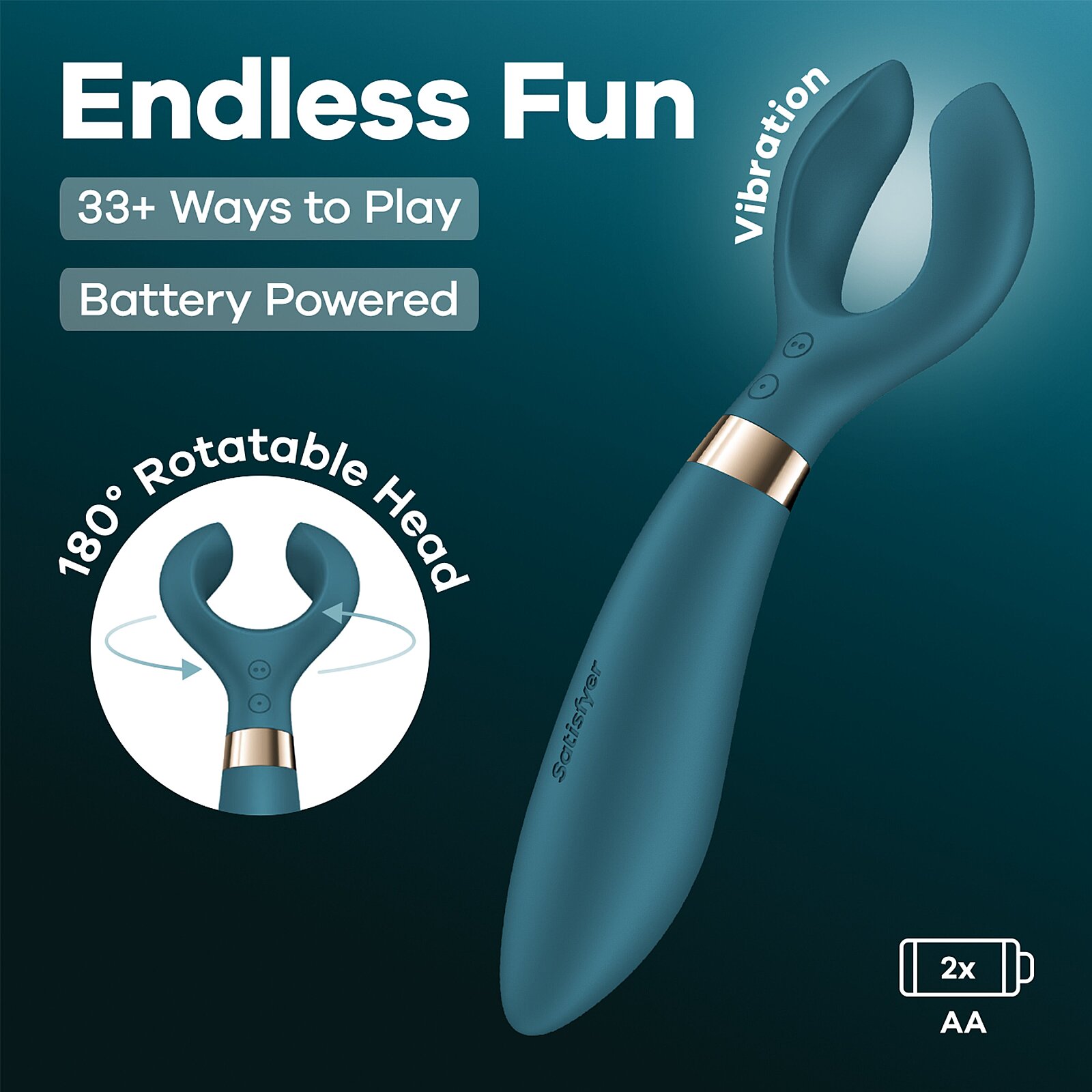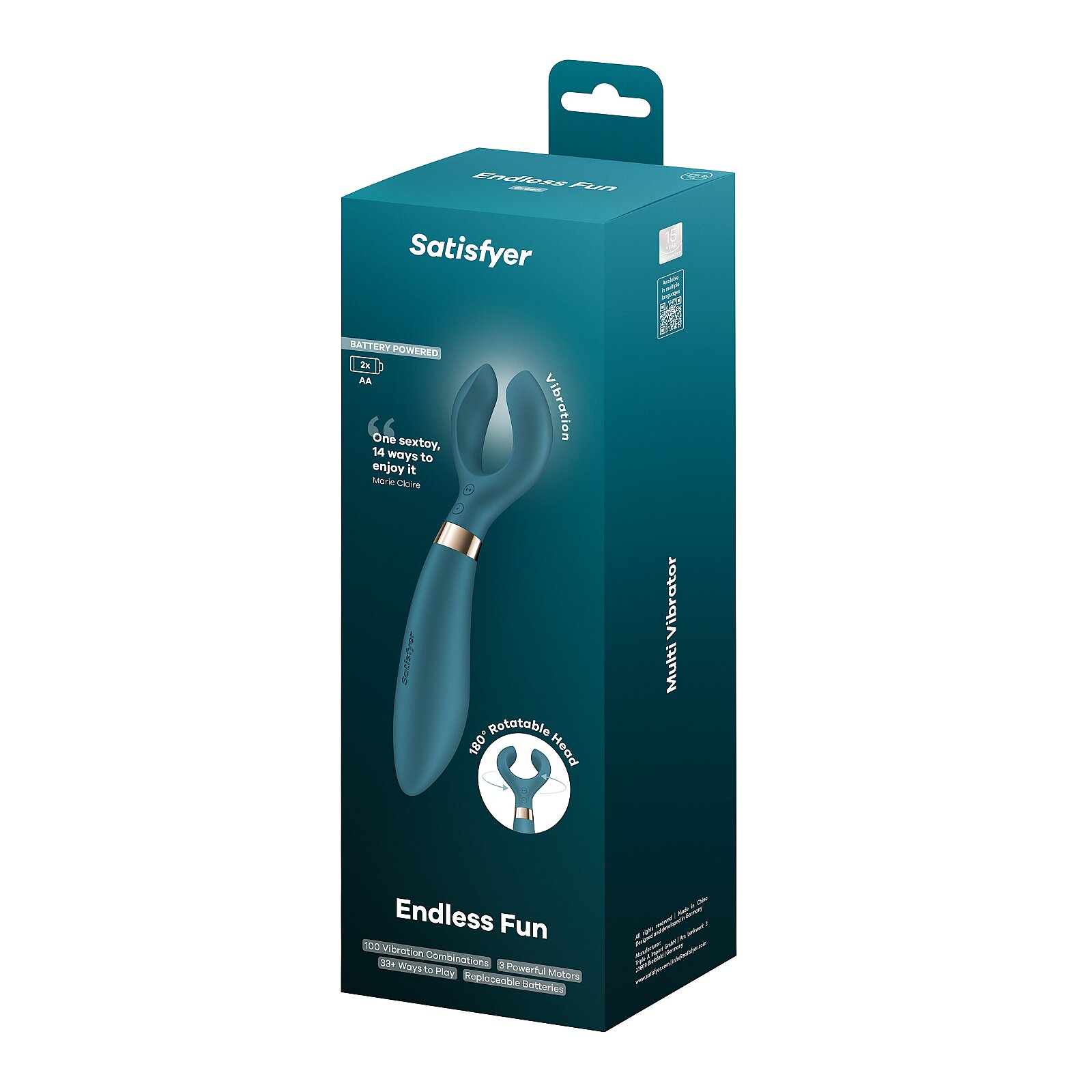 S Satisfyer a jeho Endless Fun Battery Series si užijete více než 33 možností potěšení. O tři silné motory se opře 100 smyslných kombinací vibrací, které hýčkají klitoris, G-bod i žalud. Otočná hlava v rozsahu 180° se přizpůsobí jakékoli poloze a dovolí vám hrát si bez omezení. Hebký, tělu bezpečný silikon hladce klouže po kůži a je snadno omyvatelný. Vodotěsné provedení IPX7 zve do sprchy i do vany, kde si užijete horké chvilky naplno. Napájení dvěma AA bateriemi bez potřeby nabíjení je ideální na cesty a pro okamžité potěšení. Flexibilní ramena se něžně obejmou kolem bradavek, stydkých pysků či žaludu a promění každý dotek v elektrizující moment. Ergonomické tělo padne do ruky a intuitivní tlačítka udržují tempo přesně tak, jak si přejete.