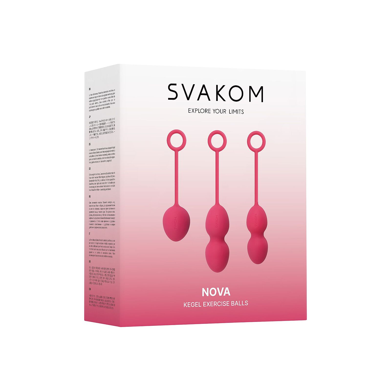 Se sadou SVAKOM Nova Kegel Balls dochází k postupnému tréninku pánevního dna ženy. Balení obsahuje 3 kuličky s různým tvarem a hlavně váhou. Postupně budeš navyšovat hmotnost kuliček a efektivně posilovat svou sexuální spokojenost.