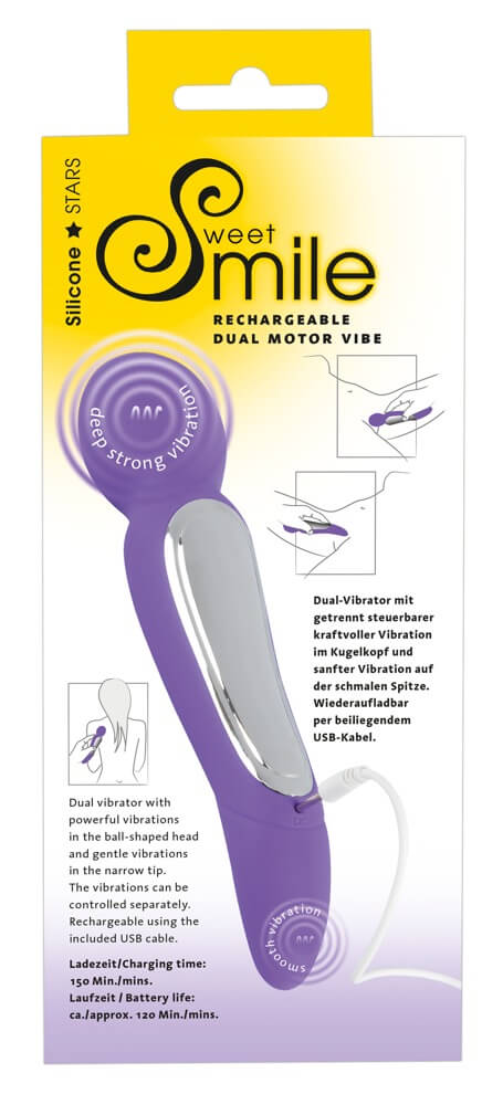 Pro své potřeby je dvojitý vibrátor Sweet Smile Rechargeable Dual Motor Vibe vybaven nabíjecím akumulátorem. Skvěle se hodí při cestování. Není třeba stále mít u sebe baterie. Pro nabíjení je přibalený USB kabel. Ten stačí připojit například do počítače, powerbanky nebo adaptéru od telefonu (není součástí). Během pár chvil bude tento milenec zase plný síly.